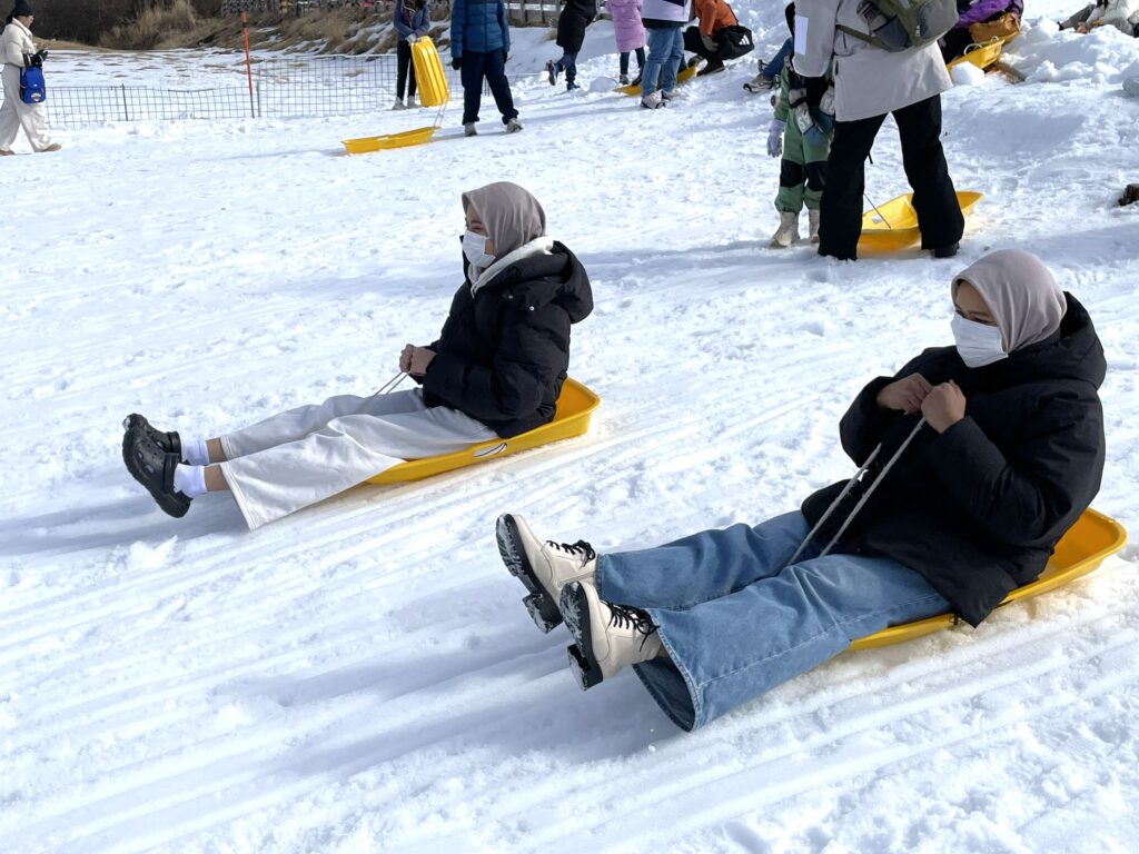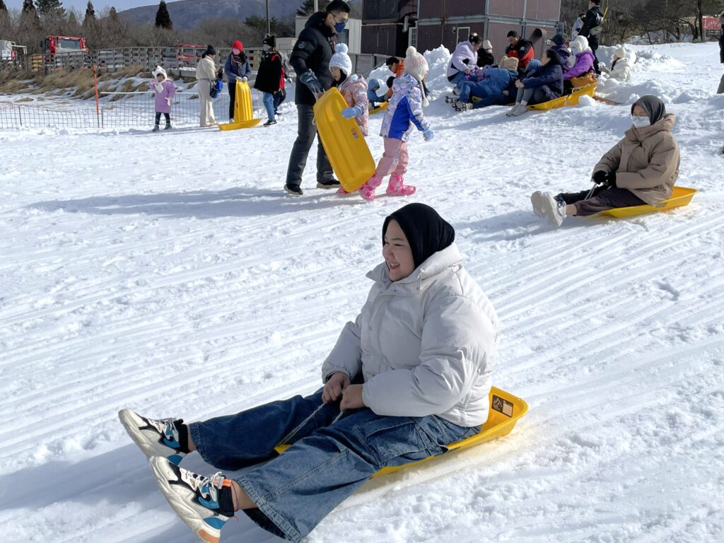 いきなりスキーやスノーボードは危ないので、「そり」を借りて雪と戯れてもらうことにしました。